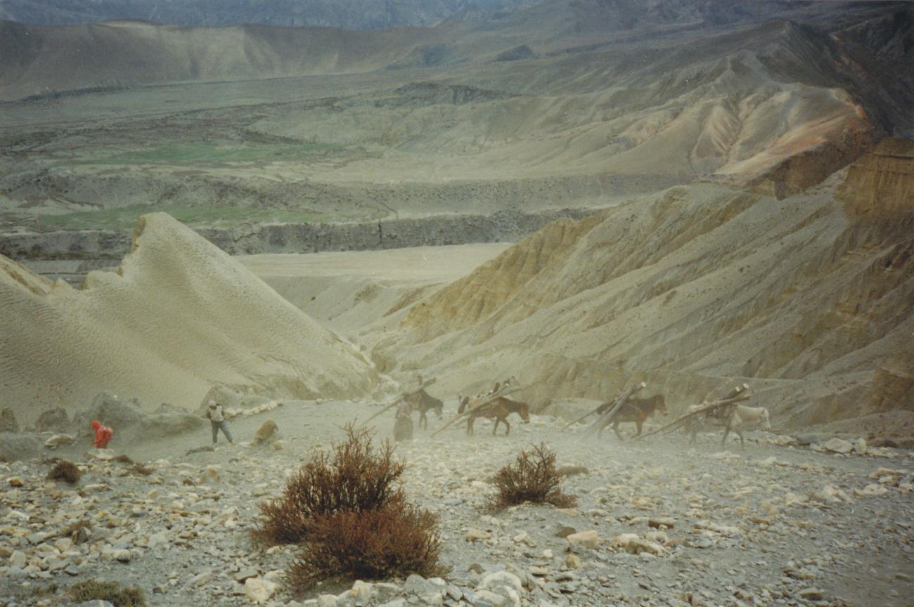Mustang – auch das verbotene Königreich genannt – befindet sich im äussersten Norden von Nepal, jenseits der Himalaja-Hauptkette. Diese Region ist stark buddhistisch-tibetisch geprägt und weist ein sehr trockenes Klima auf, werden doch die Monsunregen von den mächtigen Massiven Dhaulagiri und Annapurna blockiert. Mustang gehört zwar als Distrikt (mit Hauptort Jomosom) zu Nepal, wurde aber über längere Zeit von einem König regiert. Dieser König und seine Familie befinden sich zwar noch in Lho Manthang, der Distrikt Mustang wird seit jeher aber von kommunistischen Abgeordneten vertreten. Lange Zeit war Mustang für Touristen nicht zugänglich. Lediglich ein paar wenigen Forschern (Hagen, Snellgrove, Peissel, Führer-Haimendorf, Aufschnaiter) war es vergönnt, dort einen Augenschein zu nehmen. Im Jahr 1992 wurde die ersten Trekkingbewilligungen für Mustang erteilt. Ich bin mit einer kleinen Gruppe gleich hingefahren und konnte mich als «Nr. 16» im Gästebuch des von König Jigme Dorji Palbar Bista eintragen. Danach habe ich Mustang nochmals im 1997 besucht.